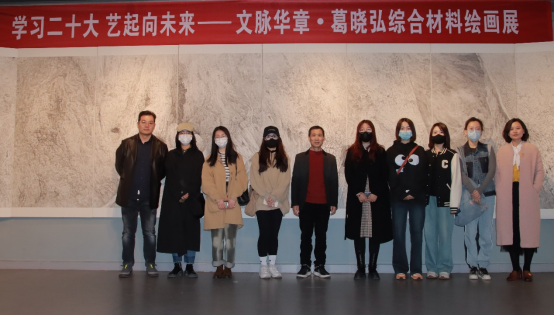 ,宁波江北区美协主席,浙江省美协综合艺术委员会副秘书长,中国美协会员,也是我院的客座教授,长于综合材料绘画和中国画创作。葛教授基于传统文化的现当代转化,把传统材料和新型的综合绘画技法融合,创作出一系列与文脉相连的优秀作品,展出的作品去年曾在中国美术馆展出。观展和座谈过程中,葛教授和同学们分享了作品的创作心路历程,在材料运用方面回答了同学们的问题。